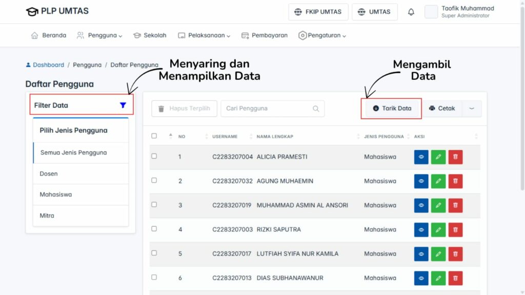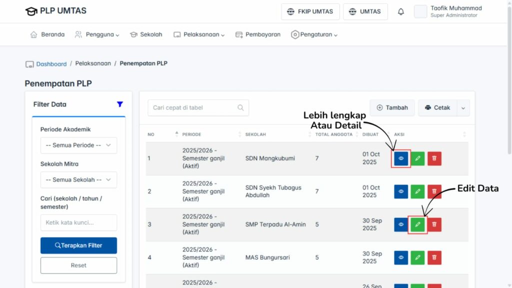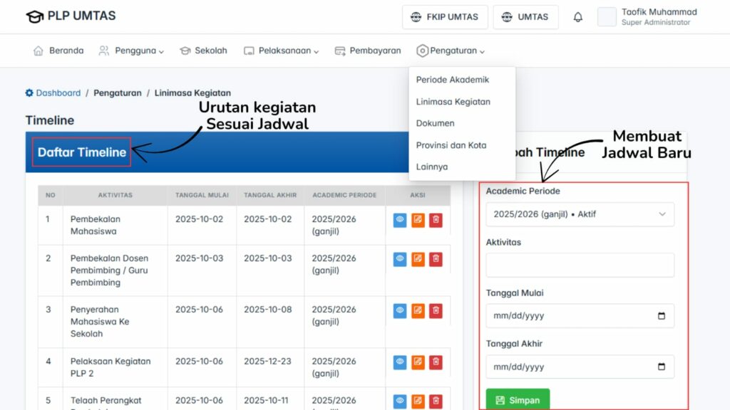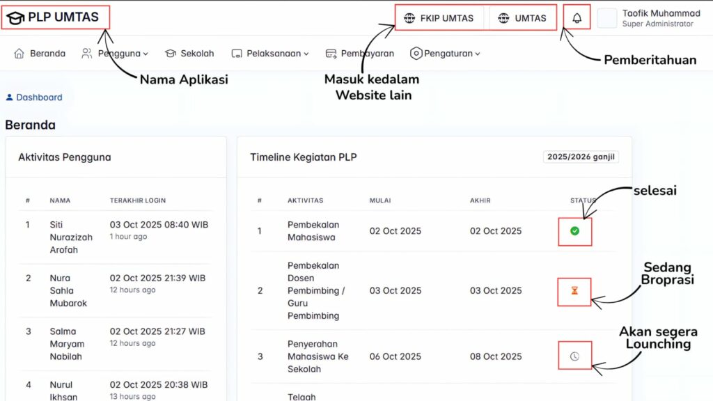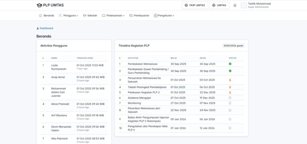 Dashboard menampilkan Aktivitas Pengguna (terakhir login) dan Timeline Kegiatan PLP (mulai–akhir + status). Admin bisa mengganti periode akademik dengan mudah, memantau kegiatan seperti Pembekalan, Serah Terima, Asistensi Mengajar, Monitoring, hingga Penetapan Nilai.