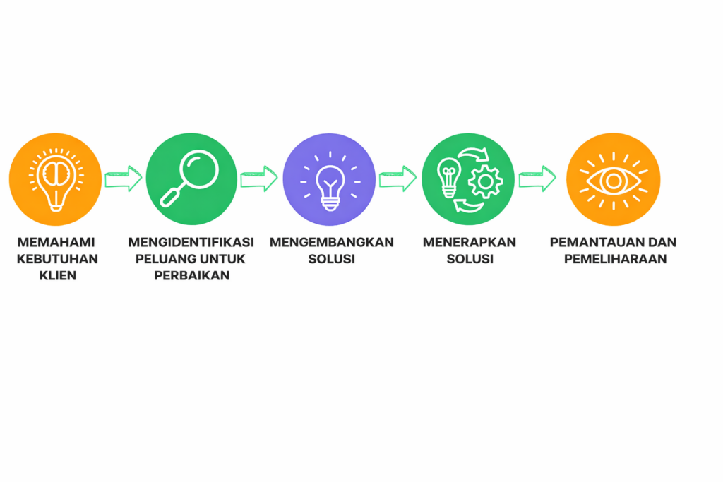 Kami menganalisis proses bisnis terlebih dahulu. Setelah itu, kami merancang fitur yang relevan dan mudah diterapkan. Dengan cara ini, kami membantu perusahaan meningkatkan efisiensi kerja secara langsung.